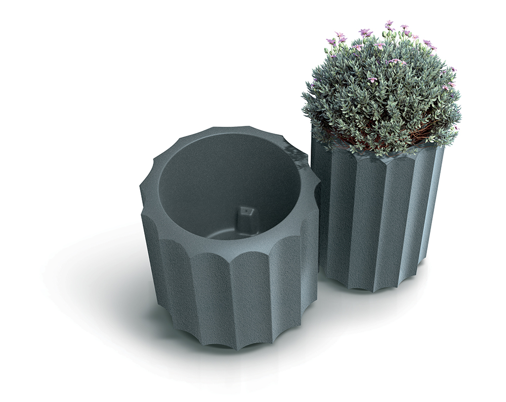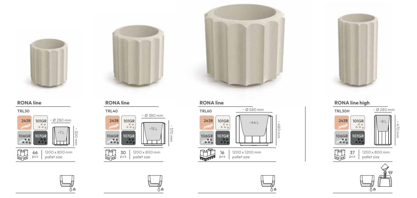 Серія горщиків RONA доповнює сучасний стиль гармонійними формами, кожна з яких є тонким натяком на природні форми. Завдяки унікальній геометрії, підкресленій широкими краями, вона візуально важча, що ще краще відповідає ландшафтним елементам.