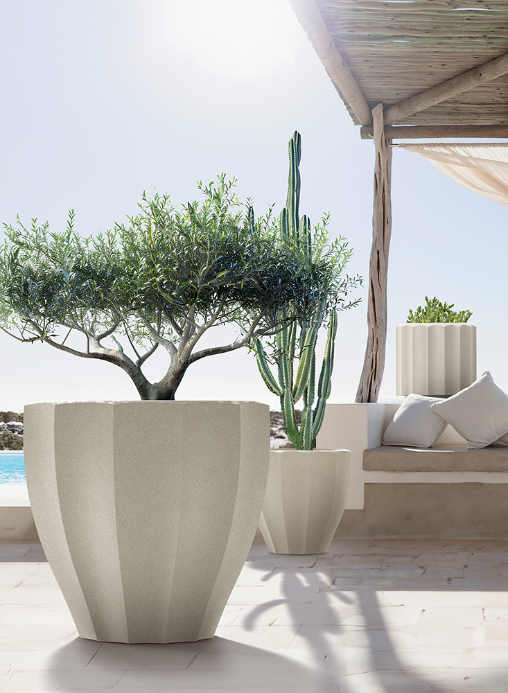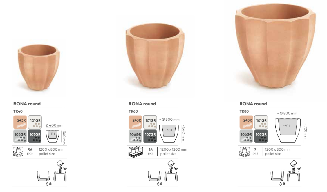 Серія горщиків RONA доповнює сучасний стиль гармонійними формами, кожна з яких є тонким натяком на природні форми. Завдяки унікальній геометрії, підкресленій широкими краями, вона візуально важча, що ще краще відповідає ландшафтним елементам.