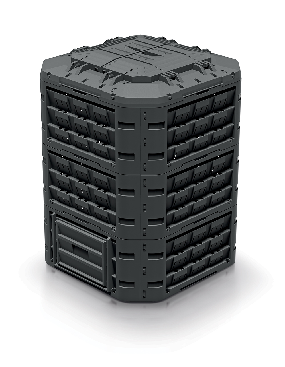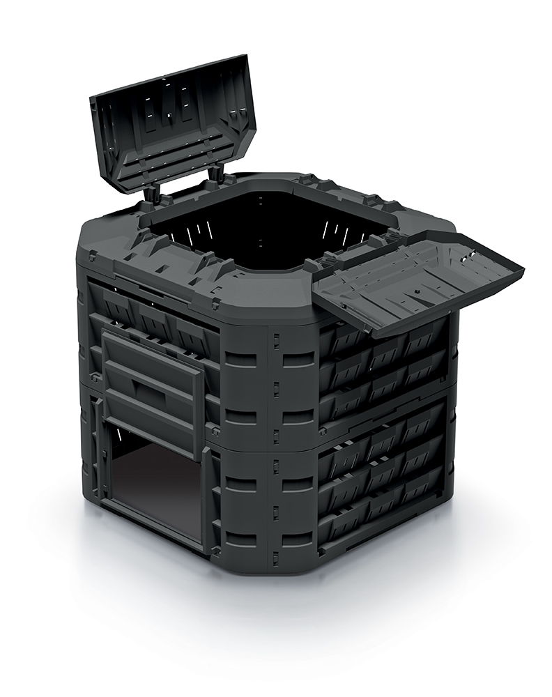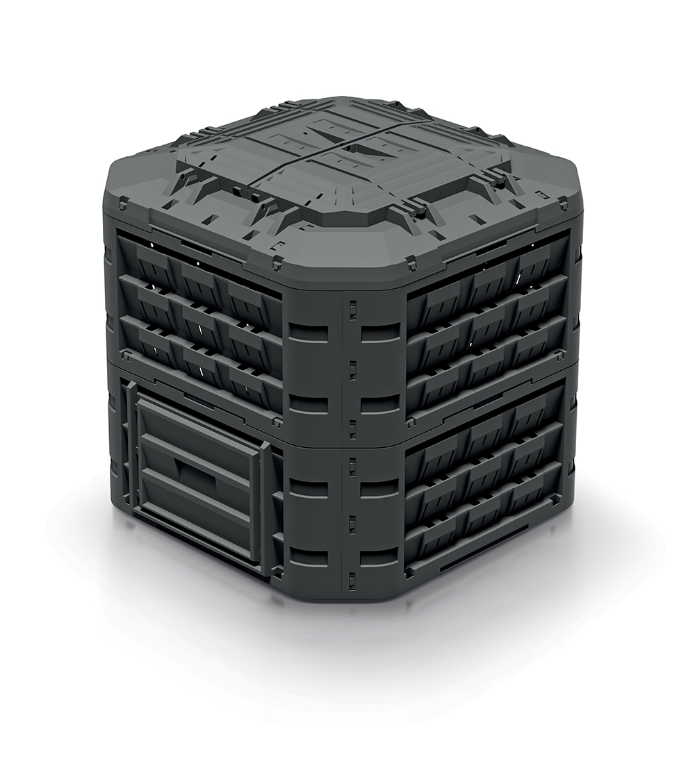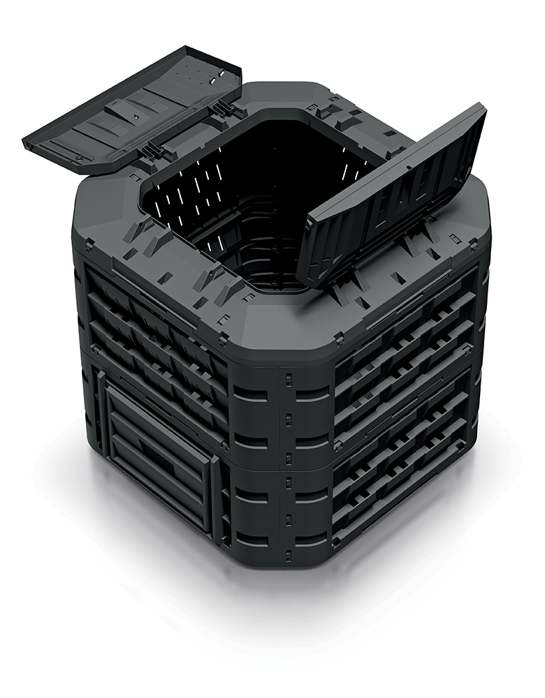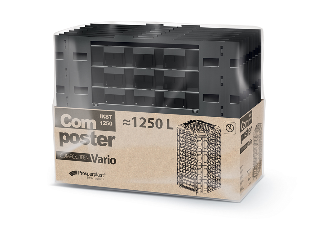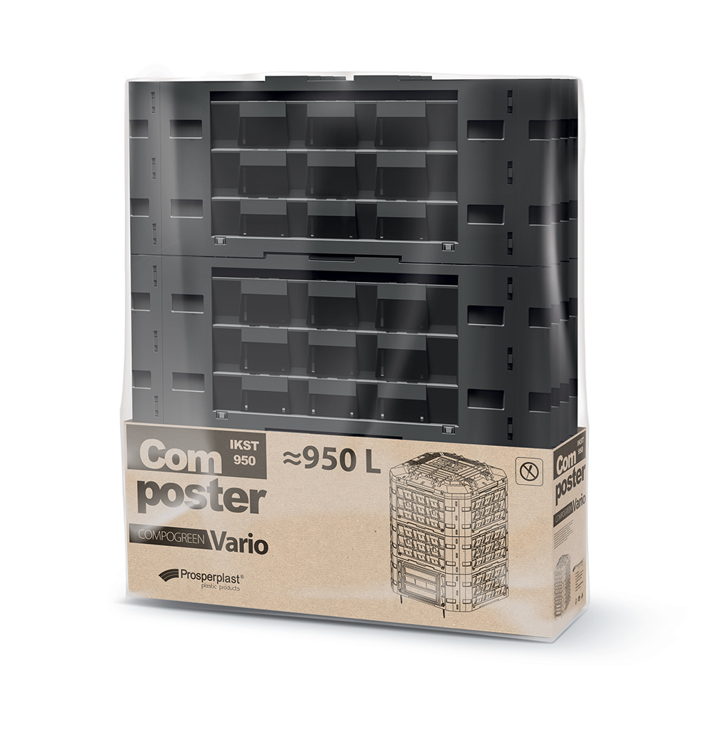 Compogreen Vario – це простий у монтажі компостер, що складається з модулів, складання якого займає мало часу і не вимагає використання інструментів. Верхній модуль оснащений великим отвором для засипання органічних відходів, який закривається кришкою, захищеною спеціальним замком (в комплекті) від відкриття вітром або тваринами. Нижній модуль має два засуви, що дозволяють зручно витягувати компост. Всі модулі оснащені великою кількістю отворів, що забезпечують належний приплив повітря для правильного розкладання органічної речовини. Нижній елемент компостера стабілізується на землі за допомогою 4 кілочків. Кілочки та замок кріпляться на час продажу з нижньої сторони кришки. Module Compogreen виготовлений з високоякісного матеріалу, стійкого до механічних пошкоджень, впливу низьких і високих температур, а також до УФ-випромінювання. Нейтральна кольорова гама та прості форми дозволяють компостеру гармонійно вписатися в ландшафт саду і не порушувати простір присадибної ділянки.