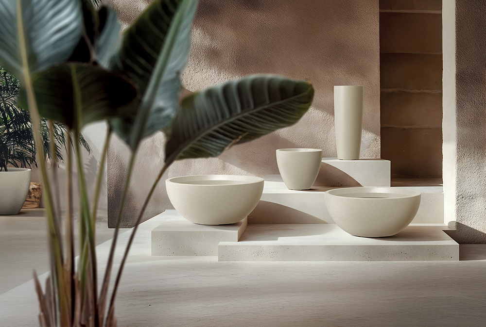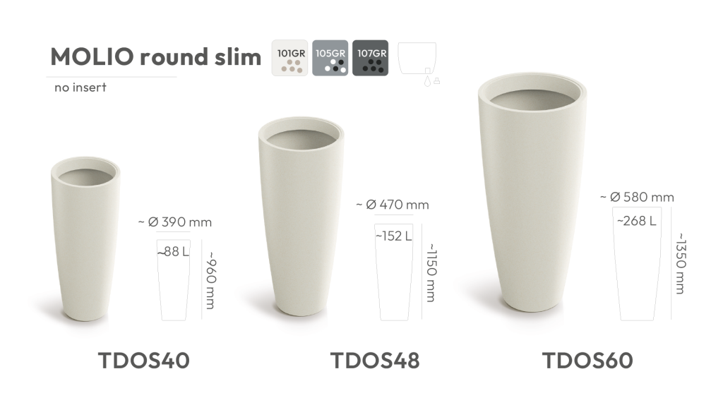 Колекція MOLIO втілює суть класичного дизайну, виражену через прості, елегантні форми. Ці квіткові горщики характеризуються гладкою, однорідною поверхнею та гармонійним профілем, який плавно розширюється догори, створюючи м’який, привабливий силует. Їхні форми базуються на фундаментальних геометричних формах – від стрункого циліндра та заокругленого конуса до низької, широкої чаші, що нагадує півсферу. Кожна форма пропонує різні можливості дизайну: