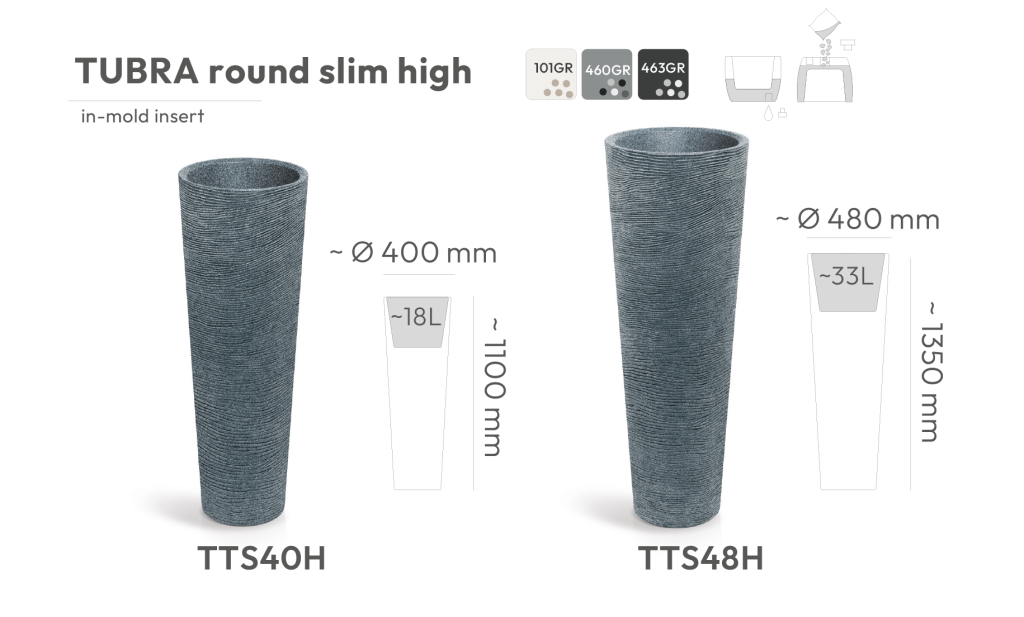 Серія горщиків TUBRA захоплює тим, як вона натякає на класичні грецькі скульптури, які добре відомі своїми гармонійними пропорціями та беззаперечною елегантністю. Колекція включає горщики різних форм – від класичних, широких форм до високих і струнких горщиків. Горизонтальні лінії, що прикрашають їхню поверхню, нагадують ретельно виліплені деталі античних колон, надаючи кожній моделі унікальної форми, якої неможливо досягти за допомогою інших технологій.